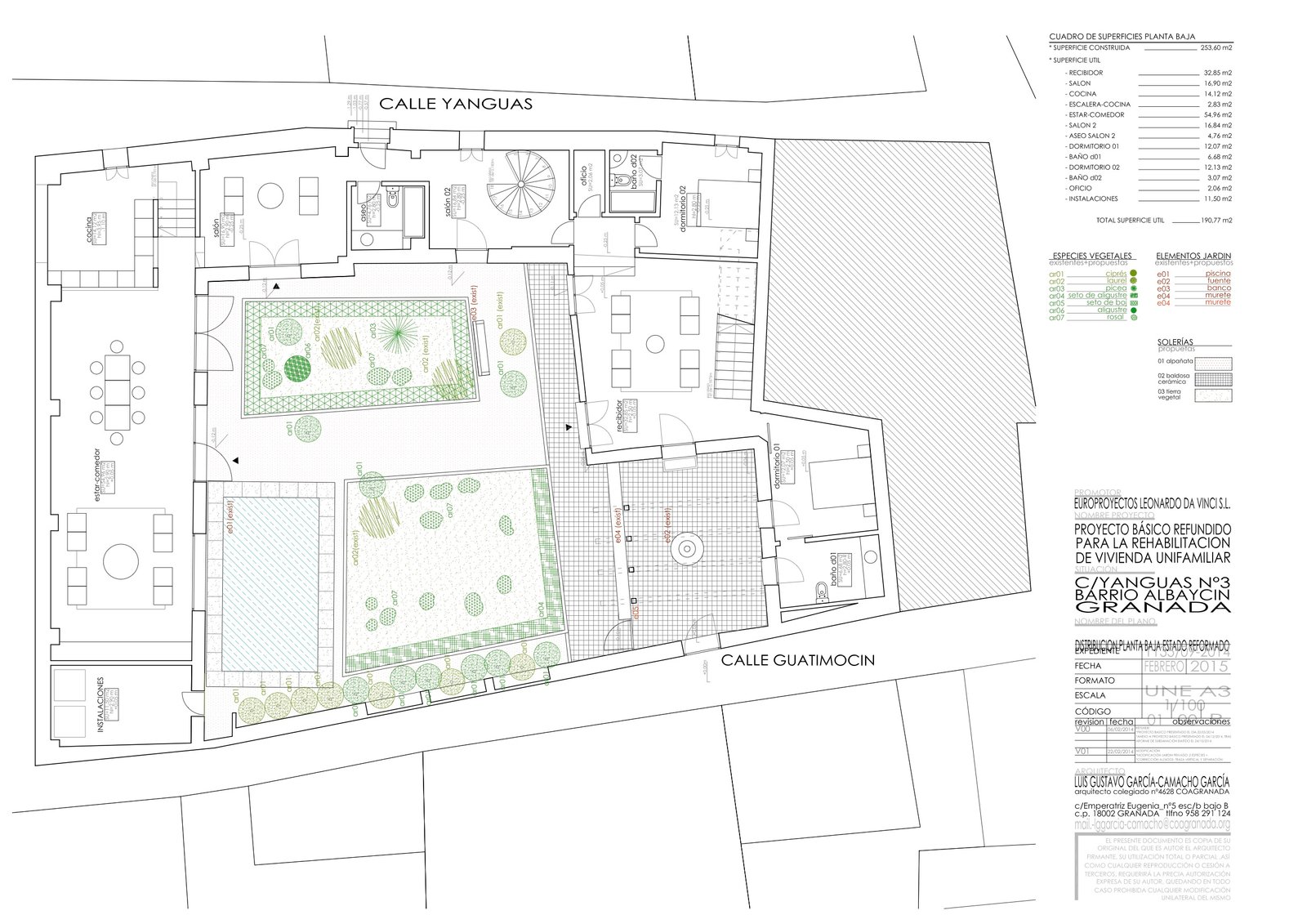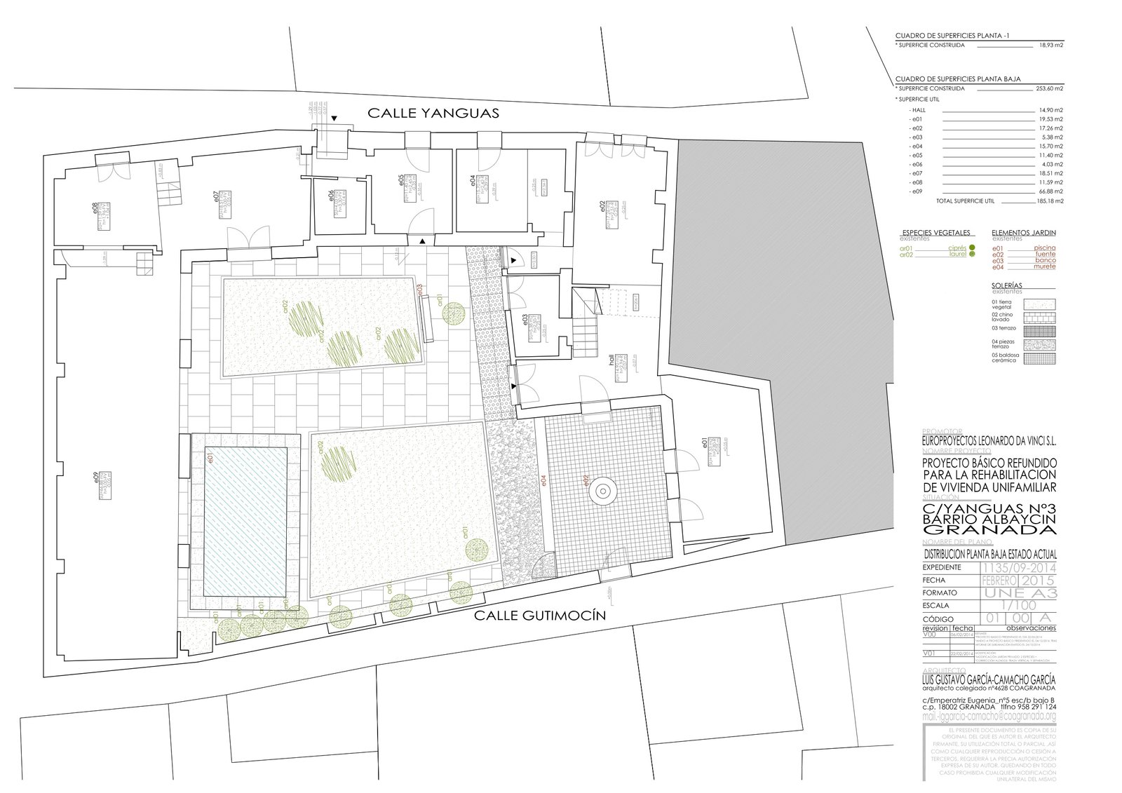 El conjunto vuelca su mirada hacia un jardín interior (catalogado por el PEPRI Albaycín) convertido a día de hoy en un mar de escombros y alguna vegetación en mal estado de conservación. Sin duda, este descuidado elemento, es uno de los más importantes del conjunto, y gran parte de la propuesta se centra en su recuperación y en las relaciones que las edificaciones que les rodean puedan llegar a tener con éste.